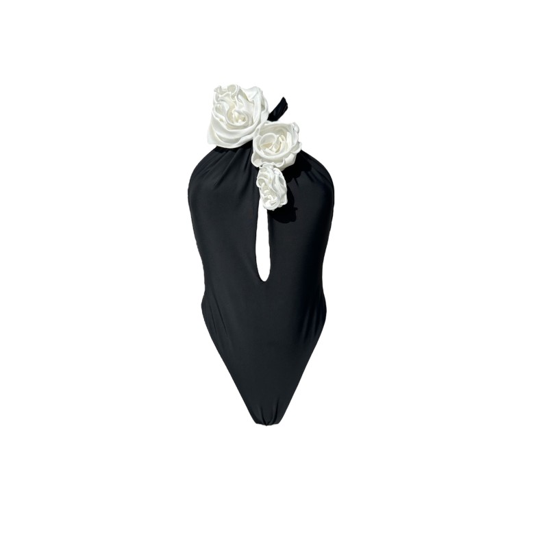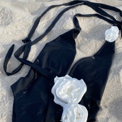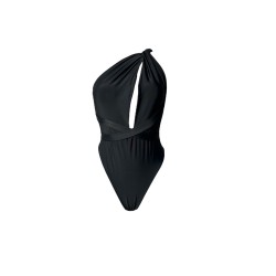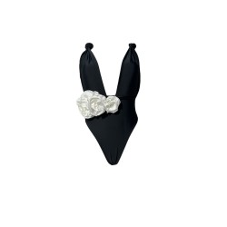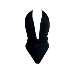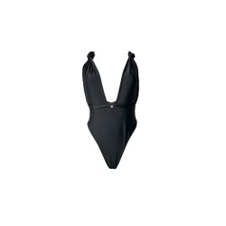 Czarna PAULA z głębokim dekoltem, stroj kąpielowy jednoczęsciowy, który ładnie podkreśla i eksponuje biust. Wiązany szarfami, na kilka sposobów. Dolna część stroju (majtki) wycięta z przodu i po bokach co daje efekt wysmuklenia sylwetki. Tył kostiumu na pośladkach z ozdobnym marszczeniem, które subtelnie podkreśla i uwydatnia kobiece kształty.
