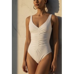 Kremowy stroj kąpielowy jednoczęściowy NY z ozdobnym marszczeniem na przodzie, głębokim dekoltem na plecach.