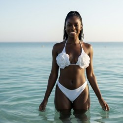 Górą BIKINI ANGEL w odcieniu złamanej bieli! Klasyczny model z trójkątnymi miseczkami nieusztywnianymi, zachwyca ręcznie robionymi różami. Wiązanie na szyi i plecach pozwalają nosić stanik na różne sposoby – klasycznie, na krzyż, czy wiązany z przodu. Delikatny materiał pięknie podkreśla opaleniznę, a róże pięknie eksponują biust.