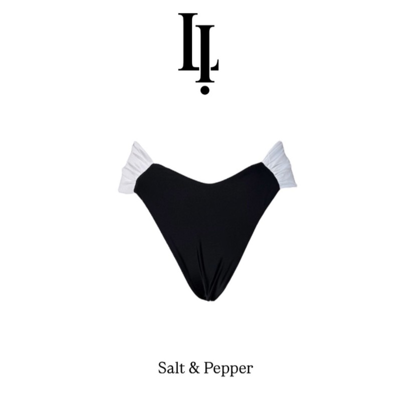 Dół bikini Salt & Pepper to połączenie elegancji i nowoczesnego stylu. Wyróżnia się kontrastowym zestawieniem dwóch klasycznych kolorów – białego i czarnego, które razem tworzą wyjątkowy, ponadczasowy efekt. Po bokach znajdują się szerokie, marszczone paski, dodające całości kobiecego uroku i subtelnej oryginalności. Wygodny krój doskonale dopasowuje się do sylwetki, podkreślając kształty i zapewniając komfort noszenia. Idealny wybór dla kobiet ceniących styl i wyjątkowe detale.