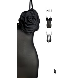 Sukienka wykonana jest z czarnego elastycznego tiulu, piersi zdobią dwie róże wykonane z satyny, wiązanie z satynowej szarfy.
